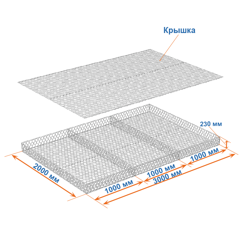 Габионные матрасы Рено 3x2x0,23: ячейка 80х100, диаметр проволоки 2,7 мм, покрытие Цинк.