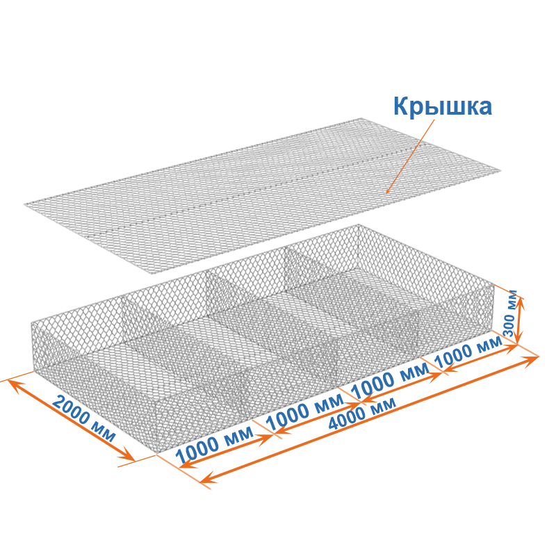 Габионные матрасы Рено 4x2x0,3: ячейка 60х80, диаметр проволоки 2,2 мм, покрытие Цинк.