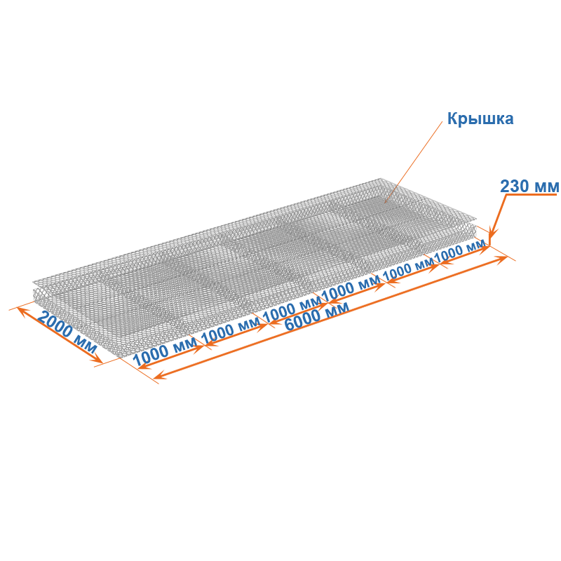 Пример применения: укрепление откосов и русел на типовых участках; заполнение камнем фракции крупнее 60х80, фиксация крышек и кромок после выверки отметок.